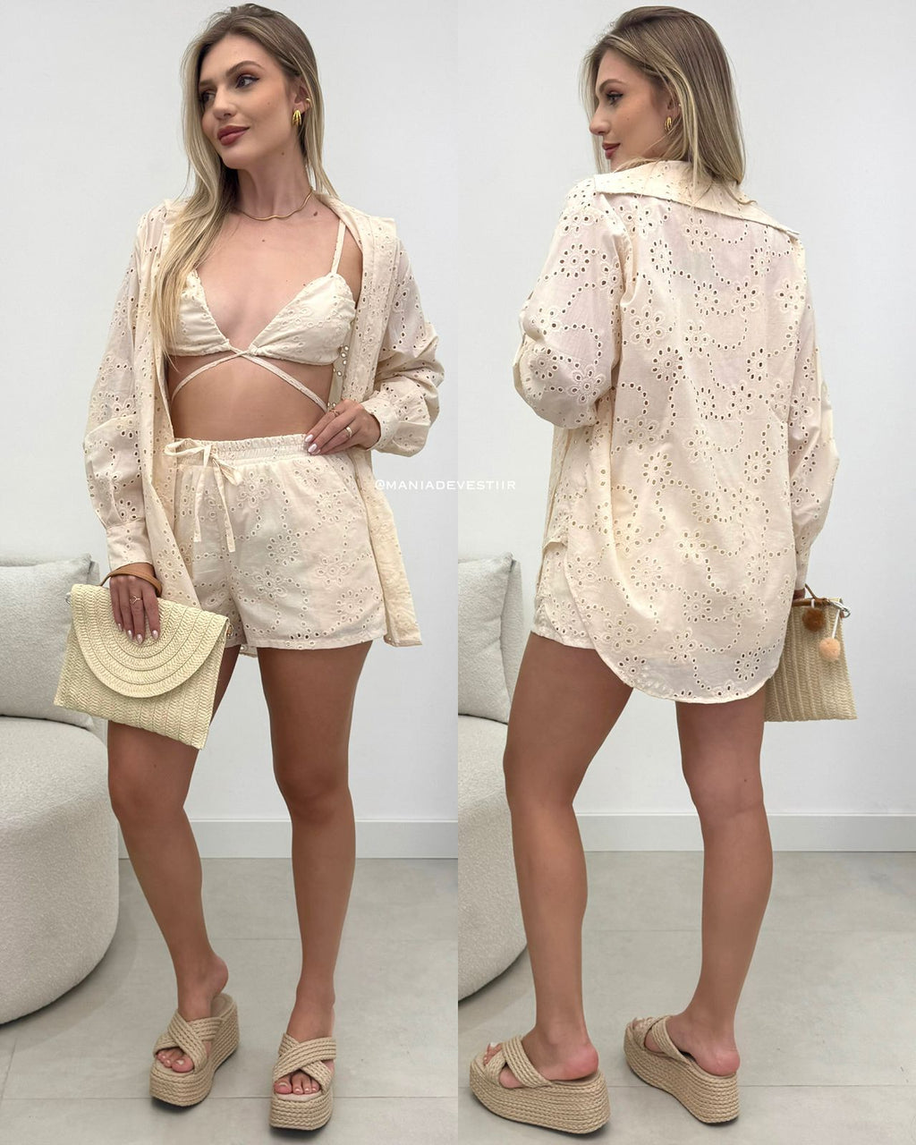 • Conjunto composto por Shorts, Top e Camisa;
